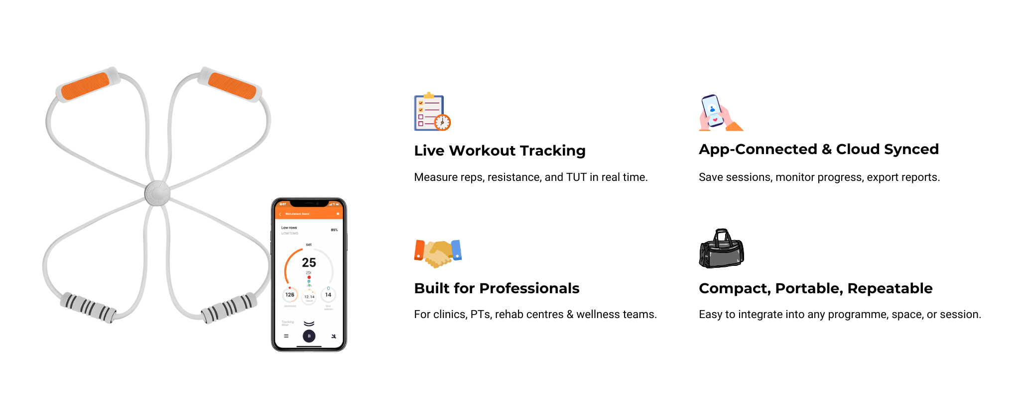 - Real-Time Workout Tracking – Measures reps, resistance, TUT, and calories burned